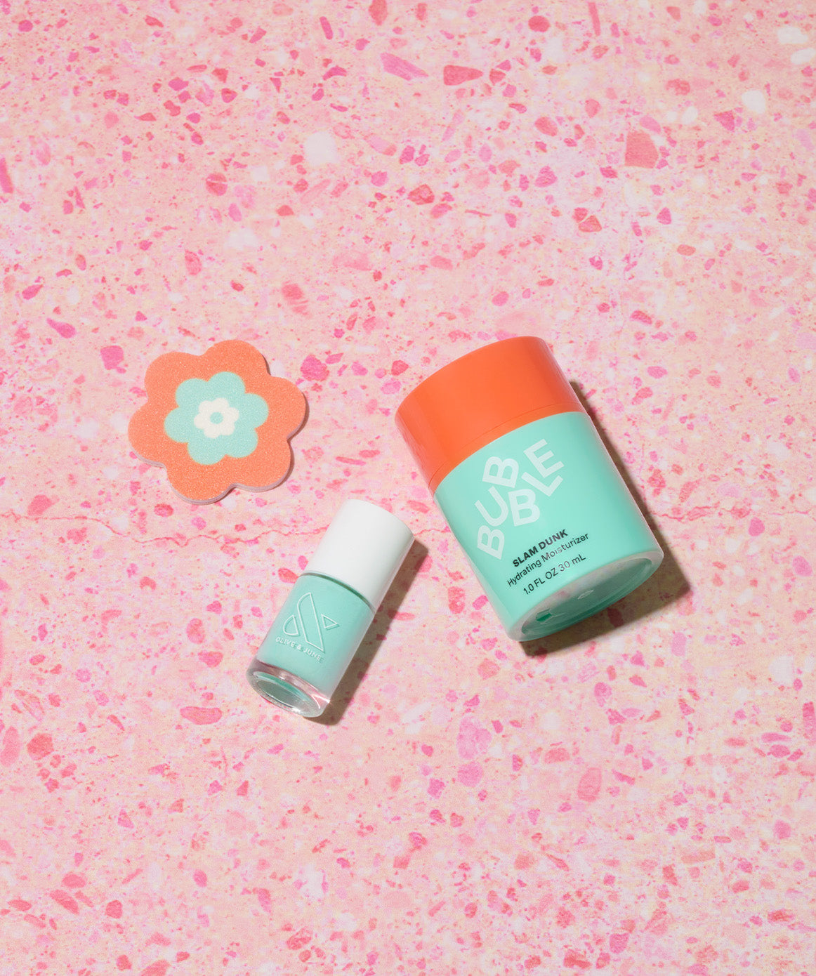 Feel the flower power with this limited-edition set from Bubble x Olive & June. Our iconic Slam Dunk Hydrating Moisturizer leaves dry faces feeling soft as a petal, and the Olive & June nail file and nail polish give you a magical matching mani!